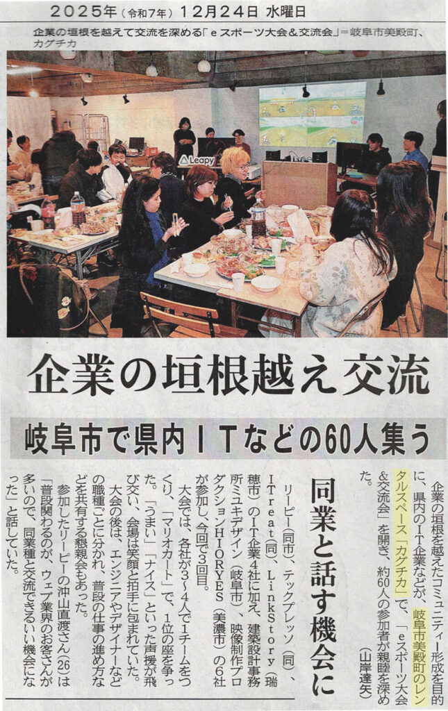 12月12日(木)に、60人の参加者がレンタルスペース【カグチカ】に集まり「eスポーツ大会 & 交流会」が盛大に開催されました。その時の様子が岐阜新聞に掲載されましたのでご紹介します。